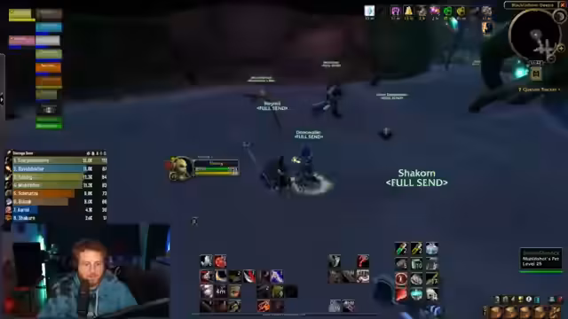 00:03:17Der Stream startet und der Streamer richtet seine Technik ein. Er kündigt an, direkt in die Raids einzusteigen, da er bereits vorbereitet ist. Er fliegt mit seinem Schurken nach Danastus, während sein Druide bereits beim Raid ist. Die ersten Versuche, World Buffs zu sammeln, verlaufen holprig und er wird beinahe getötet. Der Chat wird aktiv gefordert, ihn zu heilen.
