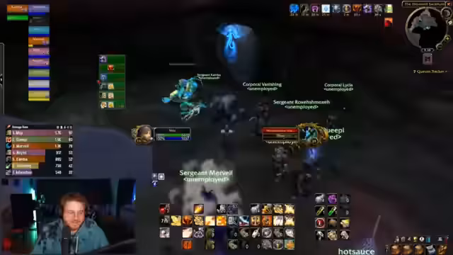 04:11:01Das Team kämpft gegen mehrere Bosse, darunter Sergeant, Scorpid und Mami, wobei Tank und Heiler eng kooperieren. Nach einem erfolgreichen Kampf wird der Loot verteilt, insbesondere eine Halskette, die an Bolzak geht, da sie für dessen Level-40-Ausrüstung bestimmt ist und er über keine alternative Halskette verfügt.