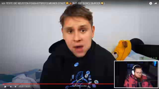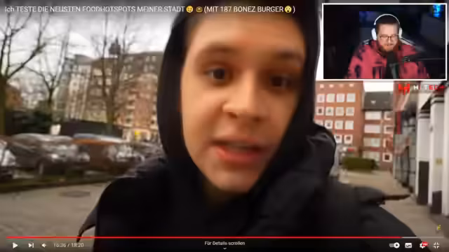 03:51:19Während der Food-Tour wird der Streamer von dem Rapper Bones, dessen Burgerladen er testet, persönlich im Laden überrascht. Er beschreibt die Begegnung als aufregend und ist von dessen 'Präsenz' und 'Aura' beeindruckt, da dieser 'zwei Meter groß' war. Er gibt an, sich nicht getraut zu haben, ihn anzusprechen.