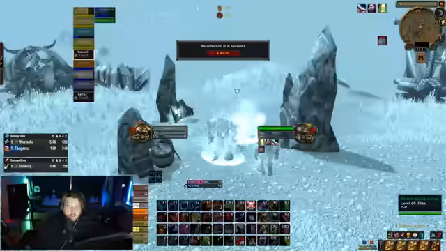 04:19:17Ein Spieler erlebt als Feral Druid erhebliche Probleme im PvP, insbesondere im Duell gegen einen Hunter und einen Mage. Da seine Manapunkte für das Verwandeln und Heilen aufgebraucht sind, ist er anfällig für Crowd Control und kann dem Druck der Gegner nicht standhalten. Seine Verzweiflung wird deutlich, als er mehrfach um Hilfe schreit und sich hilflos fühlt, da er ohne Mana nichts ausrichten kann und vom gegnerischen Team überrollt wird.