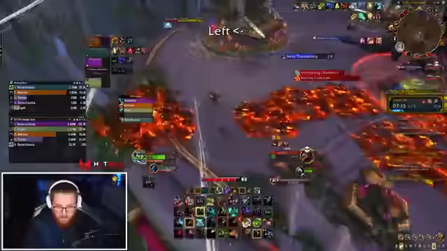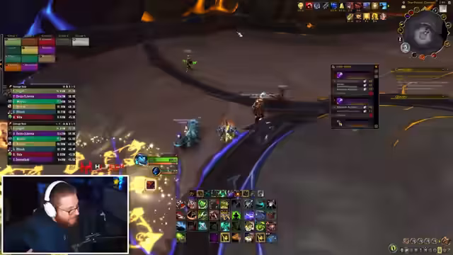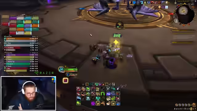 00:34:27Beim Bosskampf werden verschiedene Weak Auras zur Unterstützung eingesetzt. Es gibt Probleme mit der Bombenablage, da eine der wichtigen Weak Auras anscheinend nicht korrekt funktioniert oder verstanden wird. Nach mehreren Versuchen und Todesfällen beschließt der Streamer, die Gruppe zu verkleinern und einen Nicht-Main-Raider sowie einen Heiler zu entfernen, um die Leistung zu verbessern und den Raid effizienter zu gestalten.