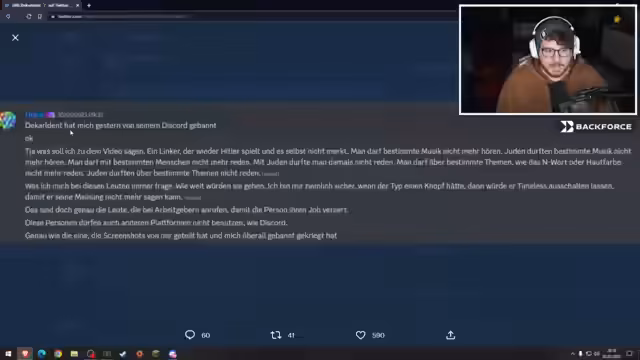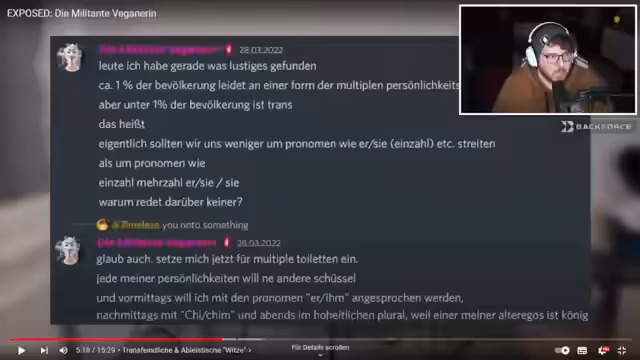 00:18:11Es wird die Korrelation zwischen Veganismus und Rechtsextremismus angesprochen und auf den Einfluss von Esoterik verwiesen, die beide Bereiche verbinden kann. Es wird ein Akteur namens 'der Germane' erwähnt, der auf dem Server agiert und dessen Verhalten toleriert wurde. Ein Beispiel ist die Frage, ab welchem Hautfarbenton man das N-Wort sagen dürfe, die auf dem Server gestellt wurde, ohne dass die Moderation eingegriffen hat. Es wird die Tolerierung von Personen mit Namen und Profilbildern von Josef Stalin kritisiert. Es wird auf transfeindliche Witze der militanten Veganerin eingegangen und ihre Aussagen zu Catcalling und Dickpics als problematisch dargestellt. Es wird ihre Verwendung des Begriffs 'Cancel Culture' kritisiert, da sie selbst Kinder und Jugendliche anschreit, die nicht vegan sind.