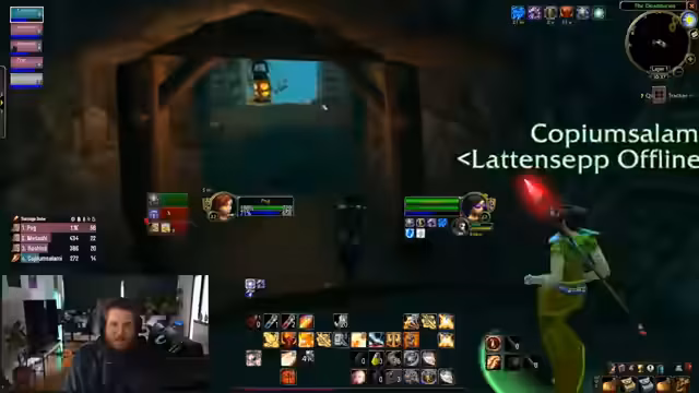 02:42:59Es gibt eine kurze Warnung vor einem möglichen Angriff durch einen Druiden und dessen Freunde in der Nähe des Dungeons, was die Gruppe dazu veranlasst, sich in Kampfbereitschaft zu versetzen. Nach einem kurzen technischen Problem wird der Dungeon-Run fortgesetzt. Die Spieler koordinieren sich bezüglich der Anzahl benötigter Taschen und verteilen diese untereinander, wobei der Fokus darauf liegt, zuerst in den Dungeon zu gelangen, um nicht von feindlichen Spielern überrascht zu werden. Ein Spieler hat noch einen Lockout und muss warten, bis er dem Dungeon beitreten kann. Die Gruppe tauscht sich über die benötigte Anzahl an Wollstoffen aus, um weitere Taschen herzustellen, und plant, den Spieler Tashi nach seinem Intro ebenfalls mit Taschen zu versorgen. Es wird kurz überlegt, ob man die Zeit bis zum Eintreffen von Tashi mit Lockout-Spielen überbrücken soll. Die Gruppe bespricht die Aufteilung der Fraktionen auf den PvP-Servern und die Mechanismen, die für ein Gleichgewicht zwischen Horde und Allianz sorgen. Abschließend kehren die Spieler zum Dungeon zurück, nachdem sie ihre Vorbereitungen abgeschlossen haben.