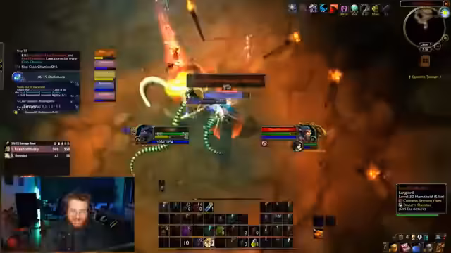 16:13:27Es wird ein Blaster-Heal für die Nacht gesucht, falls jemand noch keine ID hat. Die Frage, wo eine Eule spawnt, wird diskutiert, und der Streamer folgt dem falschen Alter. Es wird festgestellt, dass Elite-Mobs schwach sind. Der Streamer fragt, warum keiner Heiler spielt. Es wird überlegt, welche Instanz als nächstes besucht werden soll, wobei Wailing Caverns oder Starcats zur Debatte stehen. Wailing Caverns wird bevorzugt, obwohl dort angeblich nur Müll droppt, mit Ausnahme eines Gürtels für den Streamer und einer Hose für Mike. Es wird beschlossen, nur den ersten Boss zu machen und dann abzuhauen, da der Dungeon lang ist und wenig lohnende Drops bietet. Der Fokus liegt darauf, dass der Streamer schnellstmöglich Level 25 erreicht, da Mike beim nächsten Raid nicht dabei sein wird. Eine Quest in Terramor für einen Gürtel wird erwähnt.