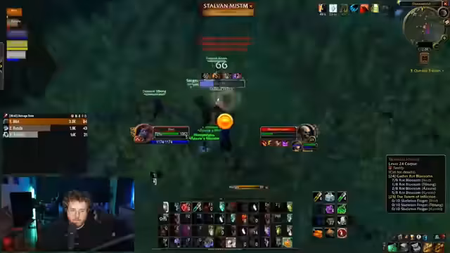 09:15:51Ein Hordler wird angesprochen und später getötet, was eine hitzige PvP-Situation auslöst. Danach konzentriert sich die Gruppe auf das Farmen von Ressourcen für die Quest "Rotten Blossom", die von Skeletten gedroppt wird. Es wird ein Gebiet mit hyperspawnenden Monstern ausgewählt, um die Farm-Effizienz zu maximieren. Der Streamer weist Asura an, mit Fernkampfangriffen zu agieren, um die Monster gezielt in die Mitte zu locken.