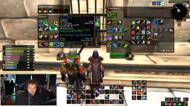 09:11:20Der Streamer kauft für 25 Gold einen vierten Bank-Slot, um alle Quest-Items zu lagern. Dies führt zu einer Diskussion über die Effizienz von Gold-Investitionen im Spiel. Später spricht er über seine PvP-Ambitionen für das kommende Wochenende, bei dem er durchballern und PvP-Inhalte genießen möchte. Es wird auch über die Unterschiede zwischen klassenspezifischem und klassenunabhängigem PvP-Gear in Retail gesprochen, wobei der Streamer Classic bevorzugt.