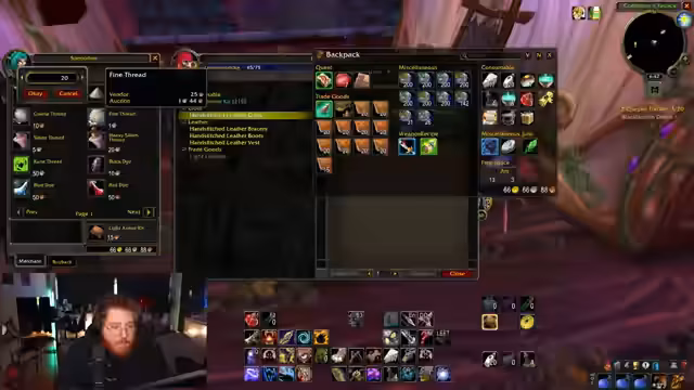 05:41:30Der Streamer beginnt mit der Lederverarbeitung, um seinem Hunter epische Handschuhe zu besorgen. Er sucht nach einem schnellen Weg, um Lederverarbeitung zu lernen und findet einen Guide von WoW-Professions, den er als sehr gut empfiehlt. Er plant, sich 230 Leder zu kaufen, um die Fertigkeit bis 100 zu leveln, und erwähnt, dass er dies bereits mit mehreren Charakteren gemacht hat. Er kauft Light Leather und Lederfetzen im Auktionshaus, um die ersten Fertigkeitspunkte zu sammeln. Er bedankt sich bei einem Zuschauer namens Cyclone für das Angebot, ihm Leder zu schicken, lehnt aber ab, da er bereits genug hat. Er sortiert sein Inventar und schafft Platz für die benötigten Materialien. Er erklärt, dass er Light Armor Kits bis 45 herstellen wird und dann Hand Stitched Leather Cloaks bis 55, um seine Lederverarbeitung zu verbessern. Anschließend will er Embossed Leather Gloves bis 100 herstellen.