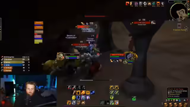 04:00:19Nach erfolgreicher Serveranbindung und Logging-In stellt sich die Gruppe aus einem Schamanen, einem Druiden und einem weiteren Spieler zusammen. Die Streamer konzentrieren sich auf das Leveln ihrer Horde-Charaktere und betreten den Blackfathom Deeps (BFD) Dungeon. Im Laufe des Runs erleben sie mehrere Wipes, die hauptsächlich auf koordinationsbedingte Fehler und unvorhergesehene Aggrozüge zurückzuführen sind. Trotzdem gelingt es der Gruppe, den Boss Crash zu besiegen und wertvolle Ausrüstungsgegenstände zu looten.