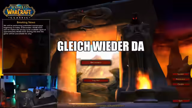 03:37:30Der Stream startet mit der Ankündigung, dass ausschließlich Horde-Charaktere auf dem Lone Wolf Server und Allianz-Charaktere auf dem Crusader Strike Server gespielt werden. Kurz nach dem Beginn treten massive technische Probleme auf, die einen längeren Unterbrechung des Spiels erfordern. Die Streamer rufen technischen Support, starten das Battle.net-Client neu und versuchen diverse Tricks, wie das Abspielen von Cinematics, um wieder ins Spiel zu gelangen. Nach mehrmaligen Anläufen und Neustarts gelingt es den Streamern, sich erfolgreich einzuloggen und fortzufahren.