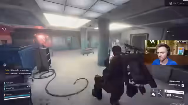 00:10:17Im Spiel kommt es zu ersten feindlichen Begegnungen. Ein feindliches Team, das mit einer Ferro-Waffe und einer Kettenmörder-Waffe bewaffnet ist, überfällt die Gruppe. Der Streamer versucht, die Situation durch Roleplay aufzulösen, indem er auf Englisch kommuniziert und erklärt, dass sie freundlich sind. Die Gegner schießen jedoch weiter, was zu einem Kampf führt und bei dem einer der Gegner getötet wird.