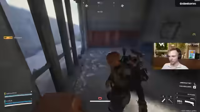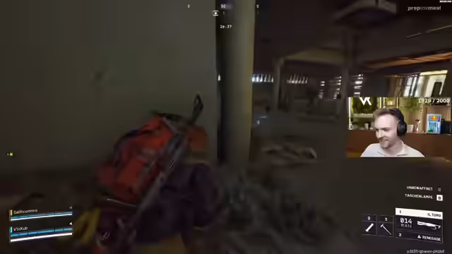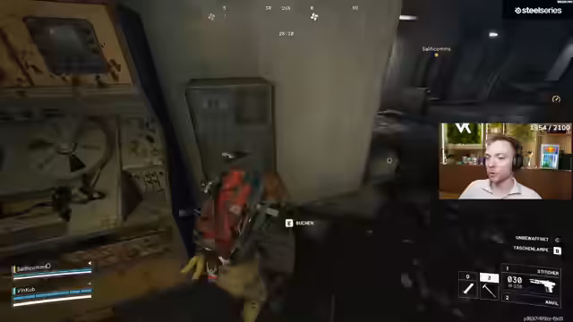 04:21:59Ein besonders hektischer Kampf geschieht, als sich mehrere Gegner gleichzeitig im Raum befinden. Der Streamer gibt per Team-Sprachchat laute Anweisungen, fordert um Hilfe, beschreibt die Positionen der Gegner und wird von Teammitgliedern unter Beschuss genommen. Der Szenario ist chaotisch und voller Ausrufe wie 'Oh fuck' und 'ich brauch Hilfe', was die stressige und unübersichtliche Lage widerspiegelt.