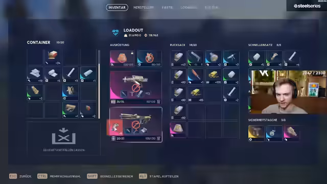 02:58:29Ein zentraler Punkt des Streams ist das sogenannte 'Looting', also das Plündern besiegter Gegner. Der Streamer demonstriert eindrucksvolle Ergebnisse, in denen er aus einer einzigen Runde Loot im Wert von 350.000 Credit zusammengetragen hat. Dies zeigt die Wichtigkeit eines effizienten Inventarmanagements, da schnell Kapazitätsgrenzen erreicht werden. Der Streamer muss sich oft entscheiden, welche Waffen und Gegenstände mitgenommen werden müssen, und speichert wertvolle Stücke in seiner 'Sicherheitstasche' ab, um sie im Falle eines eigenen Todes nicht zu verlieren. Ziel ist es, stets gut ausgerüstet zu sein und in nachfolgenden Runden starke Waffen wie Venator oder Rocketeer zu nutzen.