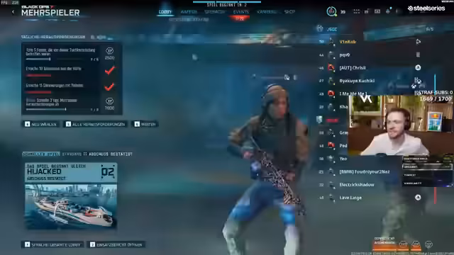 02:15:01Der Streamer findet den Raketenwerfer gegen Streaks extrem effektiv, aber gegen Gegner nutzlos. Er überlegt, auf eine andere Map wie Hijacked oder Blackheart zu wechseln, um bessere Bedingungen für Knife-Kills zu haben. Er hat nur noch 33 Knife-Kills zu erledigen, was er als "giga easy" einschätzt, aber die Herausforderung liegt in den drei Kills ohne zu sterben und den Double-Kills. Er plant, Smokes einzusetzen, sobald er Level 35 erreicht, um diese Aufgaben zu erleichtern. Er versucht, aggressiv in den Gegner-Spawn zu pushen, um Knife-Kills zu erzielen, stellt aber fest, dass die Gegner ihre Drohnen und Panzerungen gelevelt haben, was das Zerstören von Luftzielen erschwert. Er ist frustriert über die vielen Drohnen der Gegner, die ihn dominieren, aber gleichzeitig viele Streaks liefern, die er mit dem Raketenwerfer abschießen kann. Er findet die Shotguns der Gegner anstrengend, da sie ihm das Close-Range-Gameplay mit dem Messer erschweren. Er hat die Standard-Tarnungen abgeschlossen und muss nun direkte Abschüsse, zehn Streaks und zehn Feldausrüstungen mit dem Raketenwerfer erledigen.