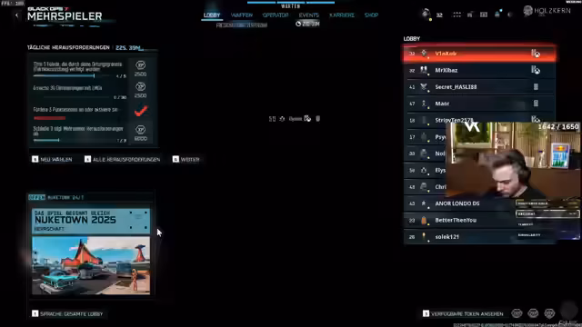 08:06:53Nach dem Quiz wechselt der Stream zum Multiplayer-Modus von Call of Duty. Der Streamer und seine Freunde bilden eine Party, um gemeinsam zu zocken. Es kommt zu technischen Problemen, wie dem Rauswurf aus der Lobby. Um dies zu beheben, wird die Lobby aufgelöst und neu gestartet. Die Gruppe versucht, eine gute Lobby zu finden und ihren Spielstil an die neue Situation anzupassen.