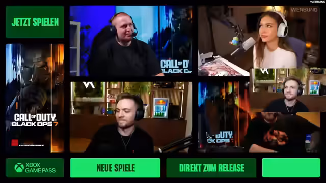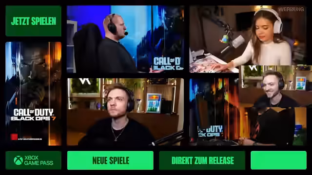 Die "Xbox Game Pass Show" präsentiert Call of Duty: Black Ops 7. Das Spiel wird gemeinsam mit anderen Spielern über den Xbox Game Pass gespielt. Es gibt Quizrunden zur Kampagne, Zombies und Multiplayer, bei denen Zuschauer im Chat Xbox Game Pass Keys und ein Call of Duty Paket gewinnen können. Die Vorteile des Game Pass, wie die große Spielauswahl und Day-One-Launches, werden hervorgehoben.