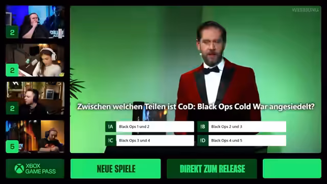 06:15:21Nach einer Einführung beginnt das interaktive Call of Duty Quiz, das von Daniel Veith geleitet wird. Dabei können nicht nur die eingeladenen Creator, sondern auch alle Zuschauer im Chat mitmachen. Gewinne wie Fanpakete mit T-Shirts, Notizbüchern und Xbox Game Pass-Codes werden ausgeloben, um die Teilnahme zu fördern. Die Quizfragen konzentrieren sich auf die Call of Duty-Reihe, insbesondere auf die Treyarch-Entwicklungen und die Black Ops-Serie.