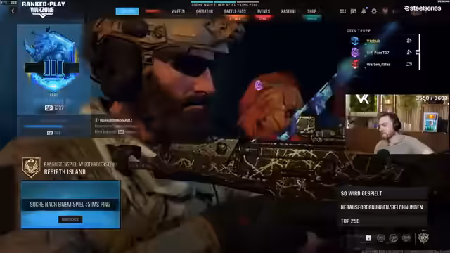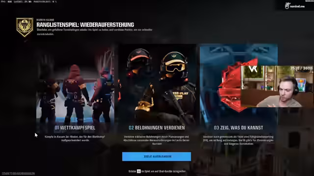 00:01:59Der Stream startete verspätet um 13:26 Uhr anstatt wie geplant um 12 Uhr, da der Streamer noch wichtige Aufgaben für seinen zweiten Kanal erledigen musste. Eine große Battlefield-Veröffentlichung steht für 17 Uhr auf dem Second Channel an, wodurch der Streamer die mögliche Exklusivität des Inhalts andeutet. Die Verzögerung führte zu Diskussionen im Chat und es wurde festgestellt, dass auch der Kameramann Scafi verschlafen hatte, was die Situation nicht verbesserte. Ein 150 Gigabyte großer Patch für den PC verursachte zusätzliche Verzögerungen, der Streamer war jedoch nach der Installation bereit für das Ranked-Gaming.