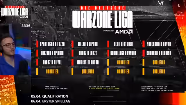 00:00:00Der Stream startet mit einem freundlichen Gruß und der Ankündigung, dass es heute um die Qualifikation für die deutsche Warzone Liga geht. Der Streamer erklärt, dass es sich um ein eigenes Projekt handelt, das in Kooperation mit AMD durchgeführt wird und ein Preisgeld von 7000 Euro umfasst. Dabei wird das Konzept erläutert: 16 Teams treten über 8 Wochen sonntags gegeneinander an, um sich den Sieg zu sichern. Heute finden die Qualifikationsspiele statt, bei denen 10 eingeladene Teams und 6 weitere, die sich heute qualifizieren, um die Startplätze kämpfen.