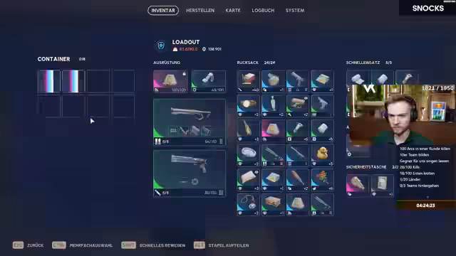 08:12:51Nach acht Stunden Spielzeit liegen 70 von 120 benötigten Kills vor, sodass am nächsten Tag noch 50 Gegner eliminiert werden müssen. Falls die Challenge scheitert, müssen alle gesammelten Items recycelt werden, bis nur noch grundlegende Materialien übrig sind. Dies unterstreicht den Druck für den finalen Spieltag. Zusätzlich wird die Strategie besprochen, durch Teamplay mit Spitzeltreibern und Massenangriffe auf ARC-Einheiten die verbleibenden Ziele zu erreichen.