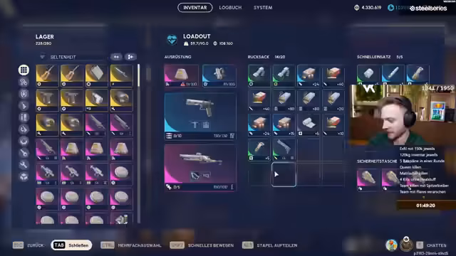 01:13:08Ausführliche Diskussion über den Inventarwert (6 Millionen) und die Schwierigkeit, durch Recyclen auf 5 Millionen zu kommen. Dabei werden Mechaniken wie das mehrstufige Recyclen von Gegenständen bis zu Grundmaterialien erläutert. Zudem werden Pläne für nächtliche Plünderungen mit 150k Zielwert und 120kg Inventargewicht geschmiedet, inklusive der Notwendigkeit, sparsam mit Ressourcen umzugehen.