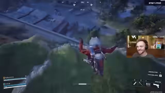 04:40:57Der Streamer entdeckt einen neuen Spot, an den man sich an einer Decke hochziehen kann, was er als verrückt und stark für den Kampf bewertet. Er macht spontan einen Clip davon für die Nachwelt. In der gleichen Runde kämpft er gegen zwei Gegner gleichzeitig und hat Glück, dass er beide eliminieren kann, was ihm einen Kill und deren Loot einbringt.