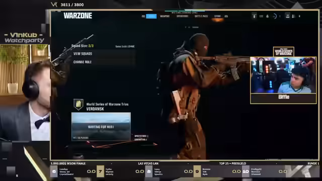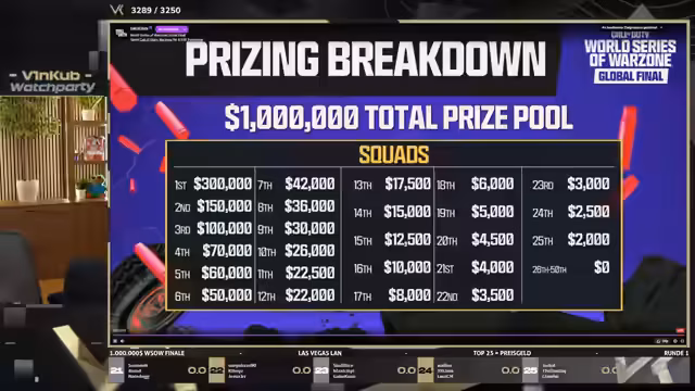 12:49:38Der Höhepunkt des Streams erreichte das Finale der World Series of Warzone. Team 'FIFA Kill' stand kurz davor, den Matchpoint zu erreichen und damit das gesamte Turnier mit 300.000 Dollar Siegprämie für sich zu entscheiden. Es wurde diskutiert, ob andere Teams versuchen würden, dies zu verhindern. Als FIFA Kill die Runde gewann, war das Turnier offiziell beendet. Der Sieg der EU-Teams wurde als 'insane' gefeiert, da 7 der Top 10 Teams europäisch waren. Der Streamer äußerte jedoch auch Enttäuschung über die toten Stimmung und die fehlende Aura der Siegerehrung.