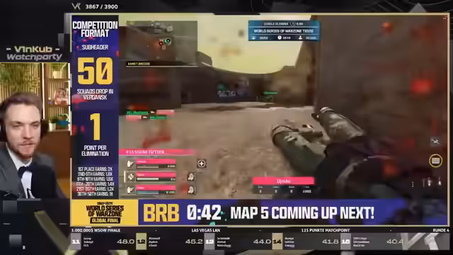 03:56:56Der Stream kündigt die bevorstehende World Series of Warzone Watch Party für etwa 20:45 Uhr an, nachdem Ranked-Spiele beendet sind. Der Zeitrahmen des Turniers ist ungewiss und kann zwischen zweieinhalb und sieben Stunden dauern, abhängig von der Anzahl der gespielten Maps. Es wird eine Zusammenfassung der teilnehmenden Teams gegeben und die Erwähnung von potenziellen Gewinnern wie Aiden, Sage oder den Falcons. Ein laufendes Gewinnspiel auf Instagram wird ebenfalls angesprochen, bei dem Mäuse, Tastaturen, Headsets, Black Ops 7 Volt Edition und eine Special Red Bull Box verlost werden.