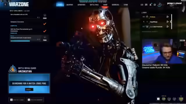 00:01:54Der Streamer begrüßt die Zuschauer und kündigt an, dass er heute versuchen will, den deutschen Warzone-Rekord von 88 Kills zu brechen. Vorherige Versuche waren erfolgreich mit 81 und 84 Kills, sodass mindestens 89 Kills benötigt werden, um den Rekord zu knacken. Er zeigt sich motiviert und zuversichtlich, das Ziel heute zu erreichen.