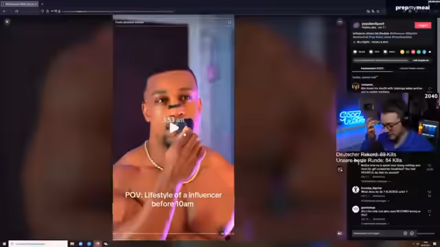 01:56:42Der Streamer thematisiert virale TikTok-Trends, insbesondere Eisbad am Morgen, und diskutiert Sinn und Zweck dieser Praktiken. Er beschreibt eine Person namens Ashton Hall, der aufgrund seiner Videos extrem beliebt wurde. Streamer äußert seine persönliche Routine und versucht diese ebenfalls umzusetzen, um den Tag energiegeladener zu beginnen. Er teilt seine Erfahrungen mit dem Eisbad und wie es ihn kurzzeitig wacher gemacht hat, auch wenn der Effekt nicht dauerhaft war.