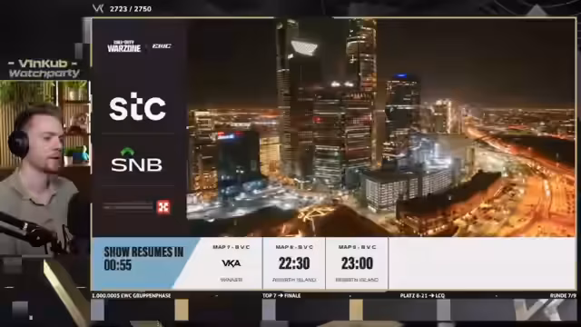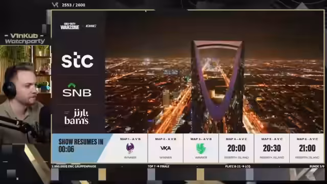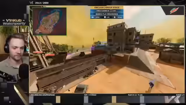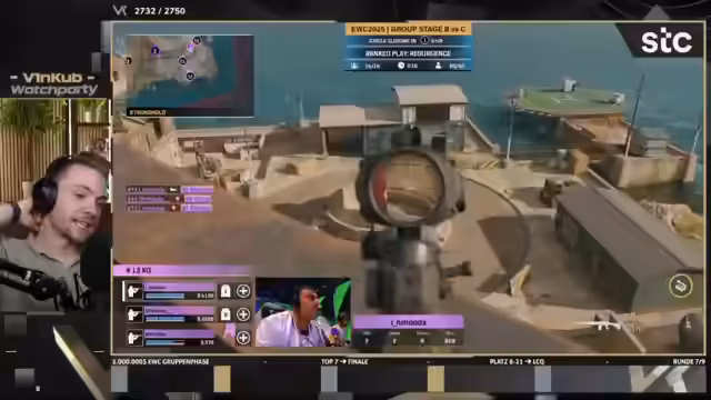 00:02:08Der Stream beginnt um 17 Uhr mit einer Watch-Party des E-Sports World Cups, einem 1-Millionen-Dollar-Turnier in Warzone auf Rebirth Island. Es wird betont, dass dies ein LAN-Turnier ist und nur ein deutsches Team, Team Leviathan (Deki, Stukex, Lace), teilnimmt. Streamer v1nkub hat auf dieses Team und Team Vision je 50 Euro auf einen Platz in den Top 3 gesetzt. Für den Folgetag, den nächsten Tag, wird die Battlefield 6 Beta für 10 Uhr angekündigt, für die Beta-Codes verlost werden.