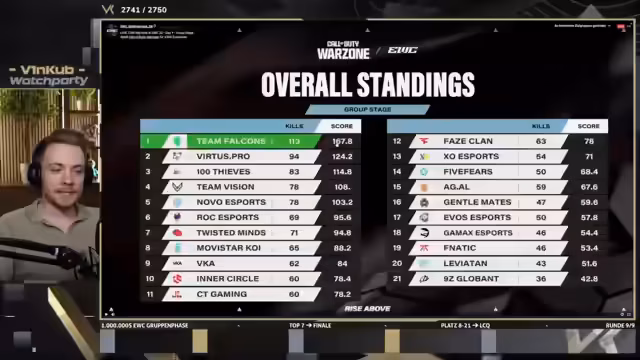 06:00:13Zum Ende des Streams wurde ein finaler Blick auf die Overall Standings des E-Sports World Cups geworfen. Team Falcons dominierte weiterhin, während Team Deki auf den letzten Plätzen rangierte und somit große Chancen auf das Finale verspielte. Die Zuschauer wurden für ihre Teilnahme bedankt und der genaue Plan für den Folgetag präsentiert: Der Stream startet um 9 Uhr, um um 10 Uhr in die Battlefield 6 Beta einzusteigen. Zusätzlich wurden die Zuschauer aufgefordert, dem Kanal zu folgen und das neue YouTube-Video zu unterstützen.