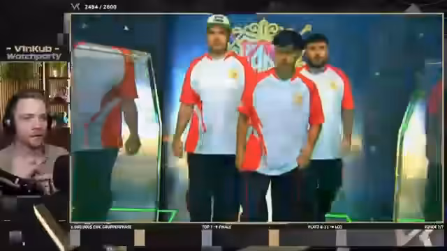 00:54:40Während die ersten Teams auf der Bühne stehen, kommentiert der Streamer die Teamnamen und Formationen. Er findet Namen wie 'Penguin' und 'Vortex' nicht besonders dominant und amüsiert sich über die unkoordinierten Bewegungen einiger Spieler. Die Anwesenheit von deutschen Spielern wird thematisiert, wobei nur DG7 als deutscher Spieler identifiziert wird. Die Stimmung ist locker und humorvoll, mit Fokus auf die visuellen Aspekte des Events.