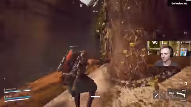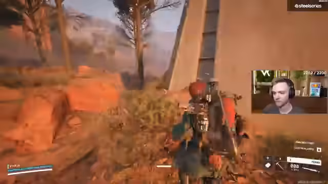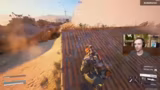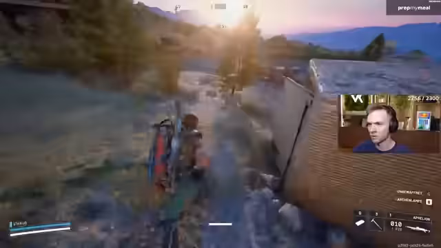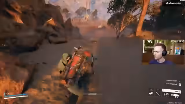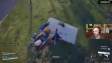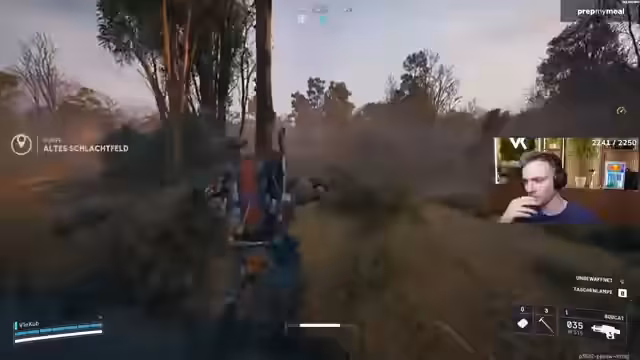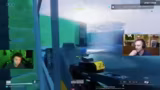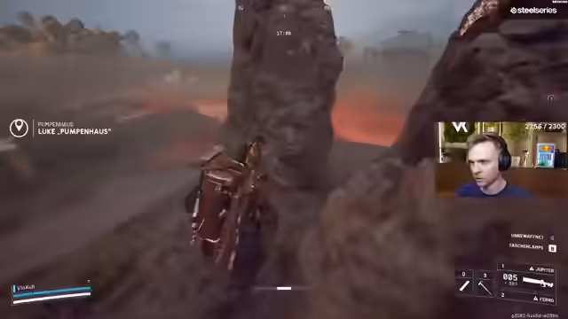 05:02:58Der Streamer ist in einer hektischen Kampsituation auf einer mit Steinen und Steppe bedeckten Karte gefangen. Er muss sich ständig bewegen, schießt und gibt sich Heals, während seine Teammates ebenfalls unter Beschuss geraten. Nach anfänglichen Schwierigkeiten und gelungenen Test-Schüssen, die Gegner knocken, wird die Lage unübersichtlich. Es kommt zu mehreren Kills, die genaue Anzahl ist jedoch unklar, und der Streamer beschreibt die Aktionen als verrückt und nicht immer gezielt.