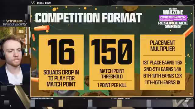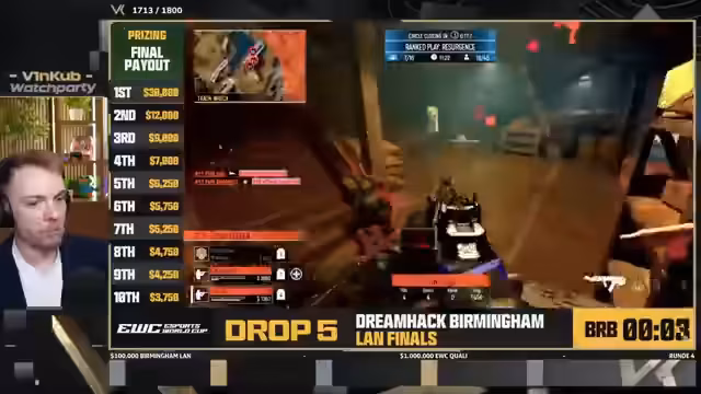 01:06:00Der Hauptfokus des Streams ist die Watchparty des Dreamhack Birmingham Turniers mit einem Preisgeld von 100.000 Dollar. Es wird die qualifizierten Teams aufgelistet, darunter Shifty, Hisoka, Echo und Spamgola aus den USA, sowie Teams aus Frankreich, Norwegen, Dänemark, dem UK und Südamerika. Die Teams müssen sich in den Top 4 qualifizieren, um direkt für den E-Sports World Cup zu qualifizieren. Melvin ist der einzige deutsche Teilnehmer, der jedoch bereits ausgeschieden ist.