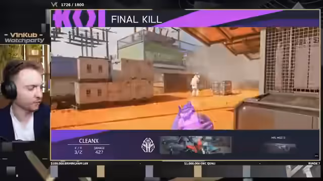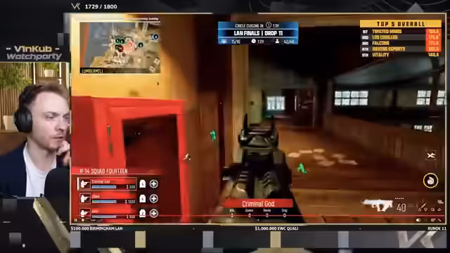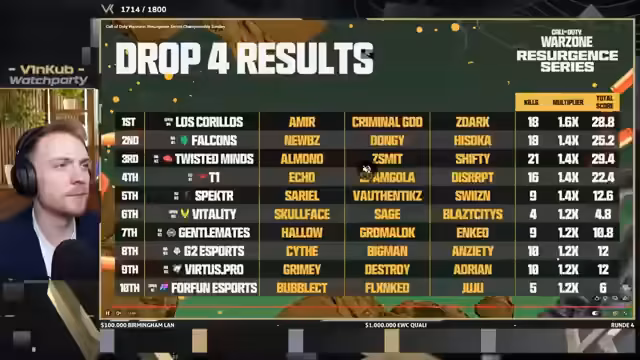 05:56:54Das Turnier gewinnt an Spannung, als Team Hisoka, bestehend aus Shifty und Soka, den Matchpoint erreicht. Damit stehen sie kurz davor, das Turnier zu gewinnen und 30.000 Dollar als Teampreis mitzunehmen. Der Streamer ist beeindruckt von ihrer Leistung, besonders von ihrer herausragenden KD-Ratio, die sie von anderen Teams abhebt. Gleichzeitig werden die aktuellen Standings vorgestellt, die den Kampf um die Top-4-Plätze und die damit verbundene Qualifikation für den E-Sports World Cup (EWC) zeigen.