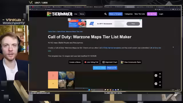 00:55:26Zu Beginn wird eine Map-Tierlist vorgenommen. Havens Hollow wird als C-Tier Map eingestuft, die weder auf dem Niveau von Area 99 noch von Wondle oder Fortune Skip liegt. Area 99 wird als sehr schlecht beschrieben, da sie sehr tot war und nur einen einzigen Landeplatz bot, der abgecampt werden konnte. Anschließend präsentiert der Streamer eine finale Wiederauferstehungsliste, die S-Tier mit Ashika Island und Almazra, A-Tier mit OG Verdansk und Rebirth Island, B-Tier mit Wondel, Verdansk 84, Fortune's Keep und Caldera sowie C-Tier und D-Tier mit den genannten Maps beinhaltet.