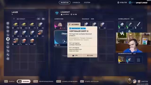 05:32:16Der Streamer testet verschiedene Aufsatzkombinationen für seine Waffe und probiert einen vertikalen Rückstoßgriff aus, der die Zielgeschwindigkeit senkt. Er reflektiert über die Ausdauer und die Gewöhnung an die Adrenalinspitzen im Spiel. Anschließend bewertet er kurz seine Waffe und fragt sich, ob man durch Sprinten weniger Ausdauer verbrauchen könnte, was jedoch laut ihm nicht möglich ist.