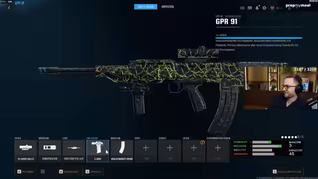 01:43:02Nach dem Tod in der Runde beginnt der Streamer, ein neues von einem Zuschauer auf der Gamescom empfohlenes Loadout zu bauen: eine Evolvere-Waffe mit einem speziellen „Unterlauf“-Aufsatz, der sie zu einer Minigun-ähnlichen Waffe mit hoher Bewegungsgeschwindigkeit macht. Er beschreibt die Begeisterung des Zuschauers über das neue Equipment und seine Rückkehr zum Streamen nach der Gamescom. Während er das Loadout zusammensetzt, unterhält er sich mit dem Chat über diverse Themen, von der Angst vor Horrorspielen bis hin zur Frage nach guten Bewegungstechniken im Spiel, und stellt fest, dass sich seine Waffe auf Nahkampf konzentriert.