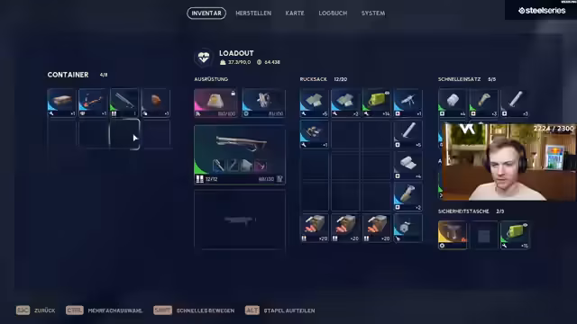 08:12:39Im weiteren Verlauf des Streams geht es in das Spielgeschehen. Es wird über die Kämpfe gesprochen, darunter der gezeigte Slide, der viel Hitze verbraucht. Die Hitze- und Ausdauersysteme werden diskutiert. Nach einem Kampf wird der gesammelte Loot besprochen, darunter Rucksäcke, Munition, ein goldener Schlüssel und verschiedene Verbrauchsgegenstände wie Energiebooster. Die Aufbewahrung des gesammelten Guts in der Waffenkammer wird kritisch hinterfragt.