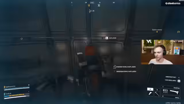 04:53:14Die Spannung steigt wieder dramatisch an, als ein Feind in unmittelbarer Nähe entdeckt wird. Es kommt zu einem chaotischen, aber koordinierten Kampf in einem geschlossenen Raum. Beide Spieler agieren schnell: einer durchbricht den Schild des Gegners mit einer Nade, der andere lockt den Gegner, um ihn in eine Mine zu führen. Der Streamer beschreibt den Kampf als stressig und aufregend, da die Situation jederzeit kippen könnte.