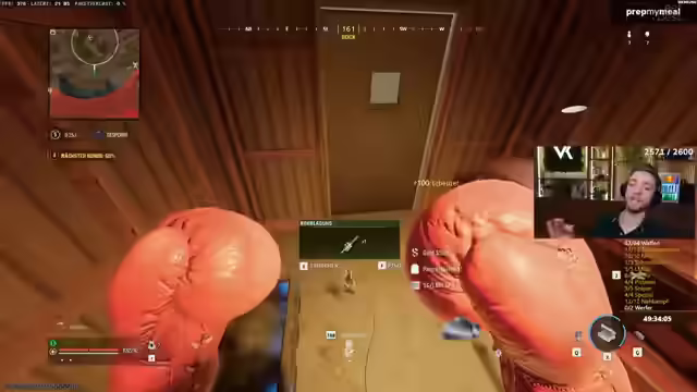01:46:36Eine Roomtour auf YouTube wird beworben, in der Details zum Hintergrund und zur Einrichtung gezeigt werden. Es wird auf Kommentare zu hohen Kosten des Hintergrunds reagiert. Zuschauer äußern den Wunsch nach Call of Duty, dürfen es aber nicht spielen. Der Streamer spricht über seine finanzielle Situation und scherzt über fehlende Prime Subs für ein Traumauto. Ein Prime Sub von Roadjack wird erwähnt. Es wird erklärt, dass bei einem Sieg mit Ground-Dude-Waffen fünf Sub-Gifts verlost werden, um dem Traumauto näher zu kommen. Der Streamer fühlt sich unsicher ohne seine gewohnte Ausrüstung und plant, aktiver zu werden. Ein missglückter Dolphin-Dive wird kommentiert und ein Neustart des Spiels aus Sicherheitsgründen angekündigt. Der Streamer bezeichnet jemanden als Senpai und erwähnt TikTok-Reaktionen. Bis 15 Uhr sollen Challenges für den GT3 RS gemacht werden. Es wird sich über das Intro "Sitz selbst" lustig gemacht, das immer noch von Zuschauern erwähnt wird. Der Streamer äußert sich erleichtert, wieder mit normalen Waffen spielen zu können und plant, Battlefield Battle Royale zu spielen. Controller Spieler werden diskutiert im Bezug auf Battlefield und Aim Assist.