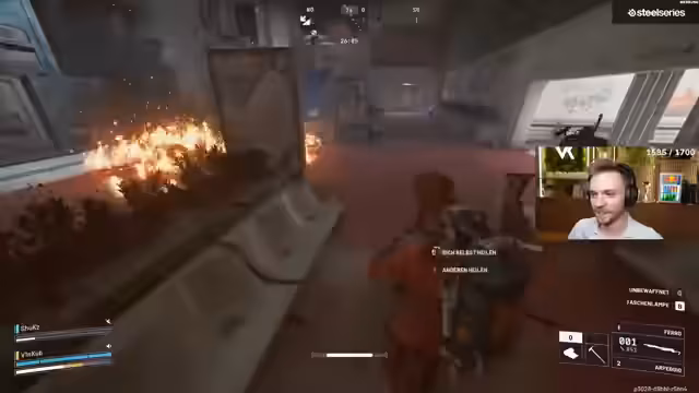 03:02:35Die Spieler befinden sich in einem intensiven Feuergefecht, bei dem sie auf Gegner treffen, die sich im Gang verstecken. Trotz des Einsatzes von Waffen wie der Wendetta und Granaten, sterben beide Spieler. Unmittelbar nach dem Kampf äußert sich ein Spieler verwirrt über die Sprache der Gegner und fragt sich, ob diese eine neue Sprache erfunden haben oder ob es sich um eine verstümmelte Sprache handelt. Es wird festgestellt, dass die Gegner eine 'blaue' Waffe hinterlassen haben, die als begehrenswert eingestuft wird. Die Diskussion dreht sich auch um die Effizienz von Waffen und Schilden, wobei die Vanita als beste Waffe im Spiel bezeichnet wird und das Mitführen von drei Schilden als überflüssig angesehen wird, da sie zu schwer sind.