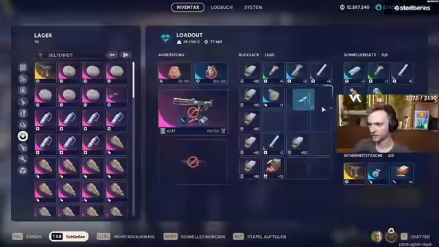 04:22:29Der Stream beginnt mit einer Bewertung der Startposition, die als schlecht beschrieben wird. Der Spieler überlegt sich, welche Ausrüstung mitzunehmen ist, und entscheidet sich für einen Energizer-Stab, da dieser als nützlich erachtet wird. Zudem wird das Recycling von Karabinerhaken erwähnt, für das man ein Exodus-Modul benötigt. Der Spieler wünscht sich, mehr Akkus mitzunehmen, da diese wichtig sind.