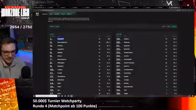 05:27:22Der Streamer analysiert die aktuellen Platzierungen des 50.000-Dollar-Turniers. Kaysers Team, bestehend aus Stevo und Omenik, führt die Rundenliste an, da ihr fehlender Teammate Kayser durch den Top-Spieler Anxion ersetzt wurde. Gleichzeitig wird die Teilnahme des amerikanischen Spielers Shifty, der für ein europäisches Team spielt, als potenziell unfair und regelumgehend diskutiert, da er einen 70er Ping aus Großbritannien hat. Die Plätze werden von mehreren 'Full-Rig-Teams' dominiert.