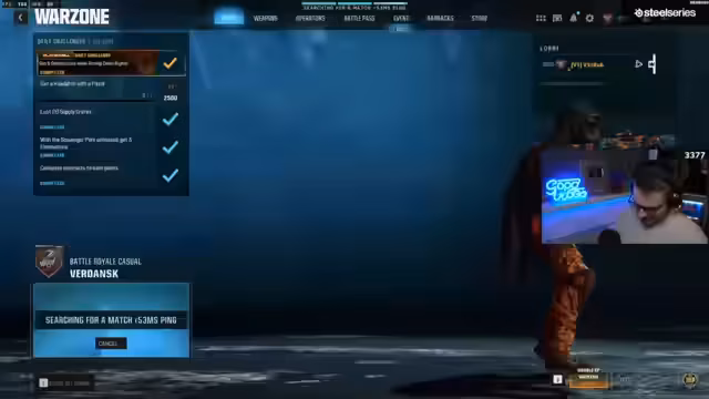 00:02:09Nach der Begrüßung der Community und einem Frohen Weihnachten beginnt der Stream mit Warzone auf der Map Verdansk. Der Streamer begrüßt einzelne Chatter und geht auf eine Frage ein, dass in ganz Deutschland Feiertag ist. Nach einer kurzen Diskussion über den Shop und neue Skins, wie das Bacon-Skin, startet er mit einer Warm-up-Runde im Battle-Royale-Modus, um sich auf die eigentlichen Runden vorzubereiten.