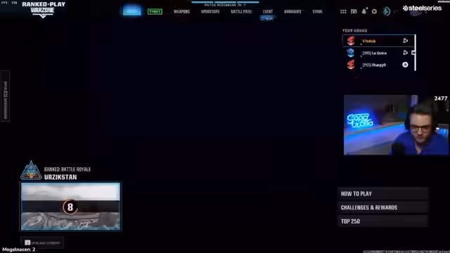 00:02:10Der Stream beginnt mit Begrüßungen des Chats und der Rückkehr nach einem gestrigen, sehr anstrengenden Quiz, das zwei Stunden gedauert hat. Der Fokus liegt heute auf dem Versuch, einen neuen Warzone-Rekord aufzustellen. Der geplante Mitspieler Ersinio ist jedoch verschlafen und steht nicht zur Verfügung, was einen Planwechsel erfordert.