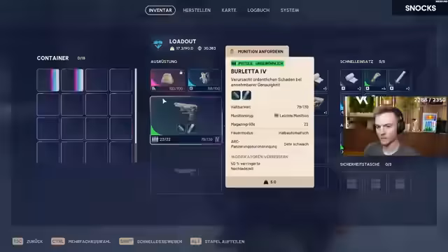 05:07:13Der Streamer beginnt mit dem Test der pinken Bettina-Waffe. Da diese nicht verfügbar ist, muss sie zunächst gecrafted werden. Während des Craftings werden die Kosten und die Vergleichbarkeit mit anderen Waffen wie der Bobcat diskutiert. Der Streamer betont, dass die Bettina für die geplante Testmap Stellamontes geeignet sein soll, obwohl sie eigentlich für Arcs entwickelt wurde. Um die Munitionsversorgung sicherzustellen, wird schweres Munitionspacket geplant, da die Bettina einen hohen Verbrauch hat. Die Chat-Community gibt Empfehlungen für Aufsätze, die dann umgesetzt werden, um die Waffe optimal vorzubereiten. Es werden auch überlegungen zu einer Wette über zwei Kills angestellt, um die Runde spannender zu gestalten.