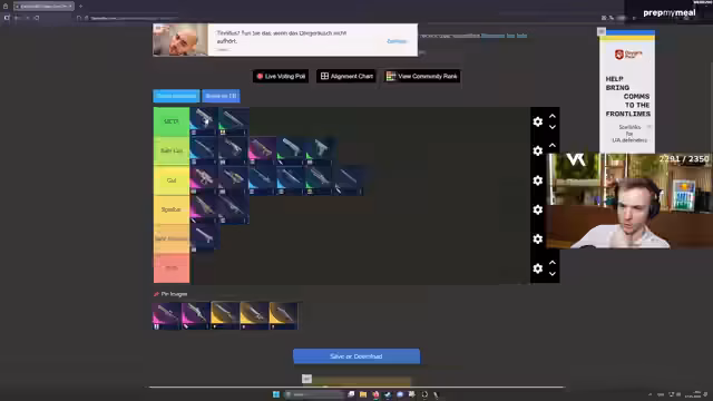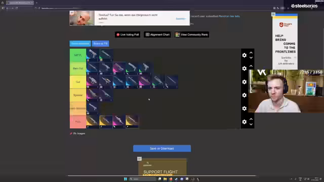 00:44:27Die Hairpin wird als eine der schwächsten Waffen im Spiel bezeichnet und soll ohne großen Test direkt in die Kategorie 'sehr schlecht' einsortiert werden. Es wird die Herausforderung besprochen, alle Baupläne für die vollständige Tierliste zu besitzen. Einige fehlende Waffen wie Aphelion oder die Osprey werden genannt. Mit Hilfe von Zuschauern werden fehlende Waffen-Baupläne beschafft, um Screenshots für die visuelle Darstellung der Tierliste anzufertigen.