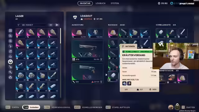 02:47:50Die Diskussion dreht sich um den aktuellen Level und den Bedarf an bestimmten Waffen und Ressourcen. Der Streamer ist im Grind-Level 45 und bittet einen Kameraden um Informationen zu dessen Level. Er beschwert sich, sein Lager sei voll und er habe zu wenig Stoff für Spritzen und zu viele Radler im Inventar, die er verkaufen will. Er betont, wie wichtig Spritzen für das Überleben sind und dass er sie als süchtig bezeichnet, ohne nicht mehr spielen zu können.