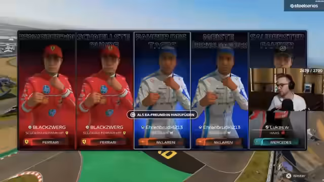 02:02:44Nachdem der Stream mit dem Wechsel in das Formel-1-Spiel beginnt, richtet er eine Private Lobby ein und fordert nur Spieler aus Österreich, Deutschland und der Schweiz auf, beizutreten. Er fährt mit dem Team Visa Cash App, das er als das schnellste und sauberste Auto im Spiel bezeichnet. Während des Qualifikations- und Rennverlaufs bewertet er seine eigenen Fahrten, kritisiert schlechte Internetverbindungen von Gegnern und zeigt sich frustriert über Kontaktschäden und Disqualifikationen von Mitspielern. Das Rennen auf der Strecke in Australien endet für ihn mit einer Platzierung im Mittelfeld.